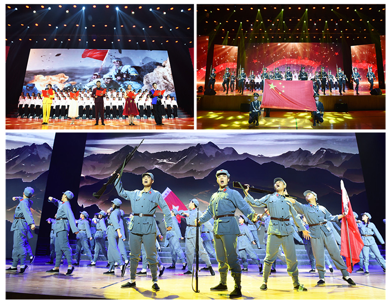 本场晚会分为“百年芳华”和“青春向党”两个篇章,在红色故事与青春回忆的别样碰撞中,回首致敬中国共产党百年奋斗的光辉历程与南工程学子勤学笃行的青葱岁月。演出在朗诵《信仰永恒》中拉开序幕,由百名学生干部合唱的《光荣与梦想》、歌曲《英雄赞歌》、朗诵《可爱的中国》、男声小合唱《把一切献给党》,表达了南工程全体师生员工拳拳爱党爱国之心和献礼中国共产党百年华诞的喜悦之情;歌曲《最好的我们》、情景表演唱《您好,母校》、器乐合奏《少年》、舞蹈《青春颂中华》、合唱《我相信梦可以像花一样开》,充分展现了莘莘学子青春心向党、建功新时代的坚定信念;歌舞剧《长征》选取突破封锁线、遵义会议、过雪山草地、胜利会师等经典片段,综合运用音乐、舞蹈、情景表演、多媒体等舞台手段,带领观众回到那艰苦卓绝的峥嵘岁月,回望血色浸染、筚路蓝缕的漫漫征程;情景剧表演《青春向党》改编自雨花台烈士事迹,天印之声广播台的同学们与雨花台烈士们进行了一场跨越时空的青春对话,令人动容。“共产党辛劳为民族,共产党他一心救中国,他指给了人民解放的道路,他领导中国走向光明……”演出以合唱《没有共产党就没有新中国》压轴,饱含着爱党深情的熟悉旋律回荡在体育馆里,令人久久难忘。