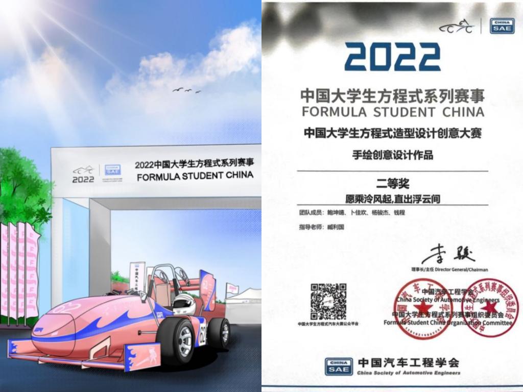 近日,由中国汽车工程学会科普教育中心主办,蔚来汽车、北京设计学会协办的2022年中国大学生方程式造型设计创意大赛落下帷幕,我校天印泠风方程式车队鲍坤靖、卜佳欢、杨骏杰、钱程同学的参赛作品“愿乘泠风起,直出浮云间”经过初赛和复赛的层层选拔,在手绘方程式赛车创意设计赛(2D)赛道中脱颖而出,荣获全国二等奖。这是该方程式车队继2022年获得中国大学生方程式汽车大赛全国三等奖后的又一好成绩。