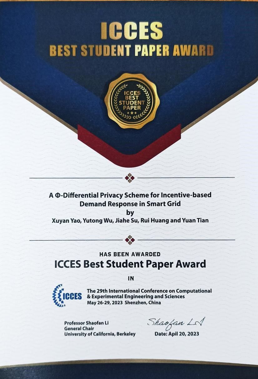 5月26日至29日,第29届计算与实验科学工程国际会议(ICCES)在深圳成功举办,由我校电气工程领域研究生姚旭艳及国际教育学院吴雨桐等同学合作撰写的论文“AΦ-DifferentialPrivacyScheme forIncentive-basedDemand Response in Smart Grid”(指导教师:田源),荣获ICCES最佳学生论文奖。