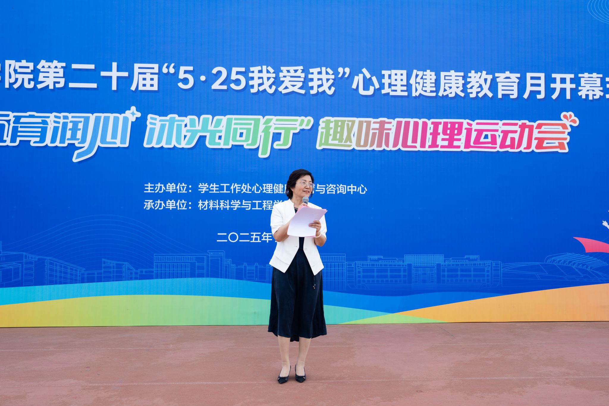5月14日下午,我校第二十届“5·25我爱我”心理健康教育活动月开幕式暨“五育润心 沐光同行”趣味心理运动会在体育公园举行。此次活动由学生工作处主办、材料科学与凯发承办。党委常委、副校长汪群出席开幕式并致辞,学生工作处负责人、各学院学生工作负责人、心理辅导员以及百余名学生代表参加活动。