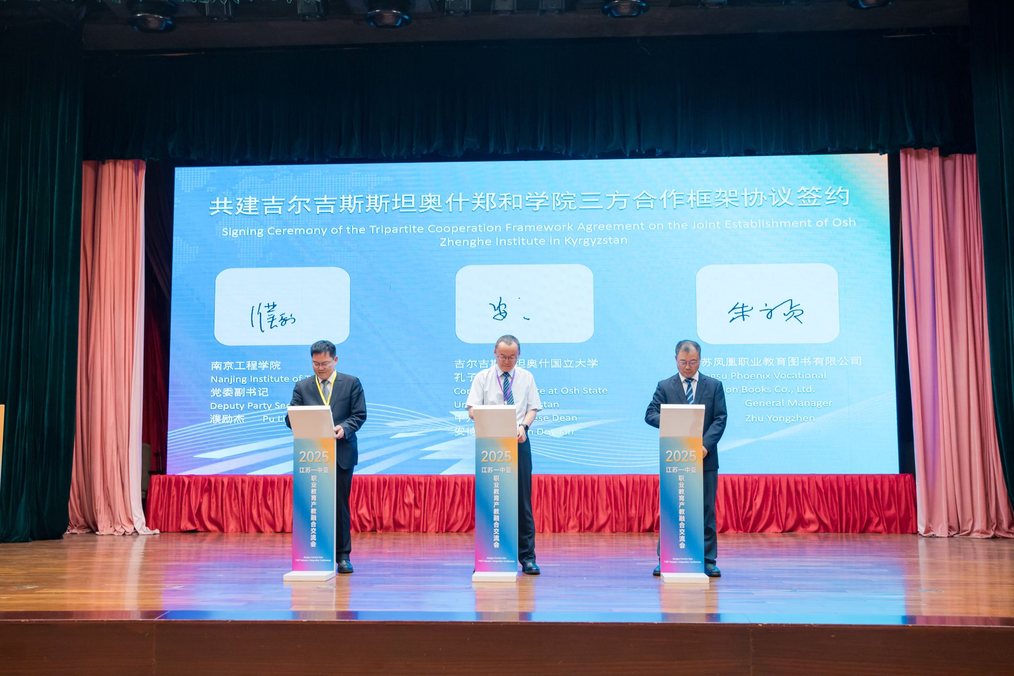 在会议成果发布环节,我校与吉尔吉斯斯坦奥什国立大学孔子学院、江苏凤凰职业教育图书有限公司共同签署“共建吉尔吉斯斯坦奥什郑和学院”三方合作框架协议。