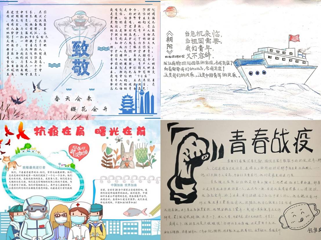 活动得到了全院学生的积极响应,线上总计收到100多份作品。作品形式多样,既有心得体悟、手抄报等传统类型,也有小视频等创新形式。谢琴绪同学笔下的白衣天使,纵使病毒肆虐,亦要奋战前线;陈宇翔同学笔下的“逆行者”,扎根基层、毫无畏惧、逆行而上;吴佳同学笔下的“中国精神”,延伸在天空与大地,闪耀在奉献和坚守,岁月不曾静好,有人负重前行。同学们用纸笔,谱写着神州大地那些抗“疫”感人的故事,也抒发了春天到来的美好希冀。最终,经过评选,机电191陈宇翔、机械182高梦同学获得一等奖,装备171吴佳等6名同学获得二等奖,机电193谢琴绪等10名同学获得三等奖。